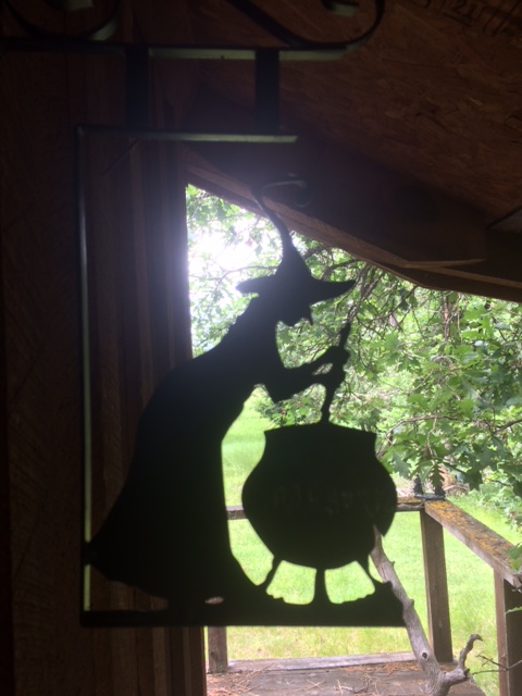 Diagon Alley metal art hangs by my writing cabin door, of a pointy-hatted witch stirring her pot–a useful metaphor for the creative impulse; writing as magical endeavor, except, it’s not. Still, I always touch the cauldron before entering my space to work. Ritual as necessary ingredient.