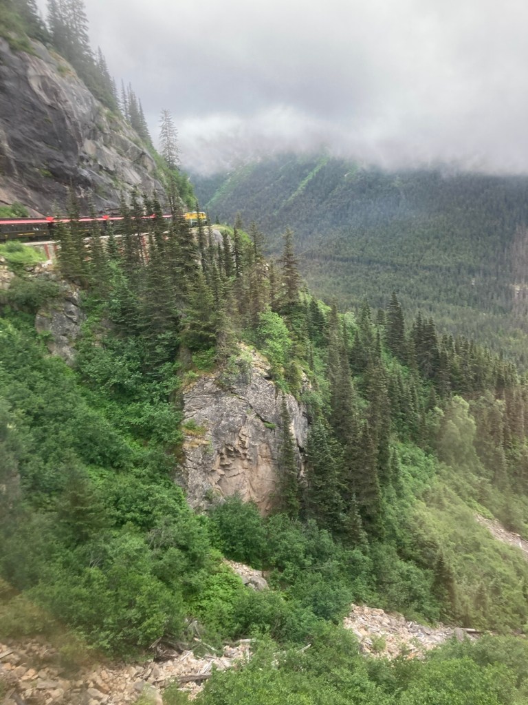 In Skagway, we rode the narrow gauge railway up to White Pass and back. Magnificent country. The guides told stories about the Klondike Gold Rush, the original purpose for this train—after the initial rush. Interesting fact…each prospector had to transport, somehow, one ton of his/her own supplies
