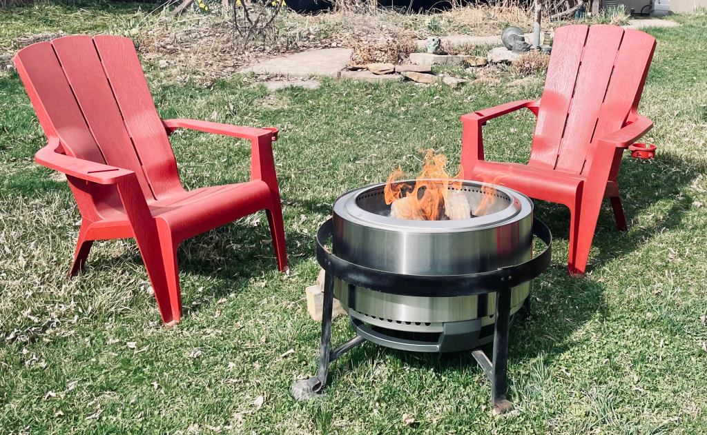 I note beauty in a new sitting area outdoors. Jaunty red Adirondack chairs cradle an exceptional birthday gift from our children, a handsome fire pit that promises to reduce smoky clouds, this having to do with genius construction to encourage airflow. We have experimented with placement to locate the most protected spot from prevailing winds: my criteria for going forward now, as I hunt for the nourishment of Beauty, like flocks of Goldfinches.